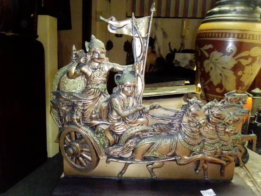 Bronze Antique Lord Krishna Arjuna Rath Chariot Statue Idol and this is a very pretty South Asian bronze piece, would make a nice doorstop or even just setting on the shelf as decor....I am not sure if it went with more pieces nor do I know how old this piece is.