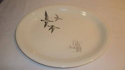 THIS VERY PRETTY VINTAGE JOHNSONS BROTHERS OF ENGLAND CERAMIC LARGE FOOD PLATTER AND MATCHING VEGGIE BOWL HAVE A FLYING GEESE PATTERN. THE PLATTER MEASURES 35.5cm x 27.5cm AND THE VEGGIE BOWLS MEASURES 19cm ACROSS. THERE IS A LITTLE USAGE WEAR AND TEAR, BUT THEY ARE STILL IN GREAT CONDITION.
