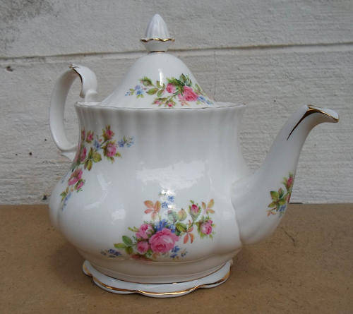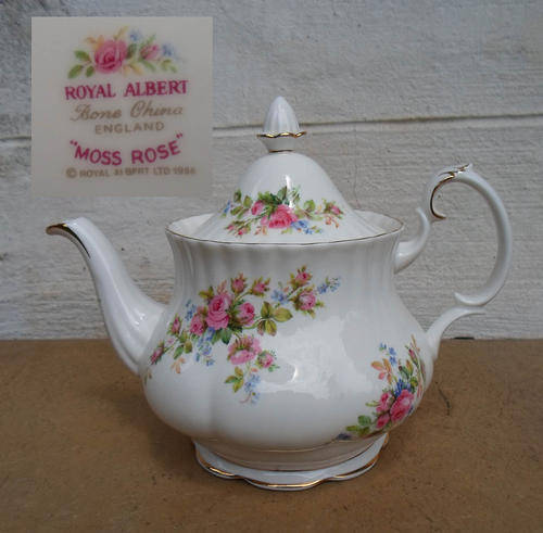 LOVELY VINTAGE ROYAL ALBERT MOSS ROSE 6 CUPPA SIZE TEA POT WITH LID. POT IS IN ALMOST NEW CONDITION, SADLY THE LIP ON THE LID HAS COME OFF, HOWEVER LID FITS SNUG SO NOT DETRACTING AT ALL. NO CRACKS, CHIPS OR REPAIRS TO THIS POT, NO CRAZING, GILT VERY GOOD. STANDARD 6 CUP SIZE. SEE MY OTHER LISTINGS FOR THE REMAINDER OF THIS SET.