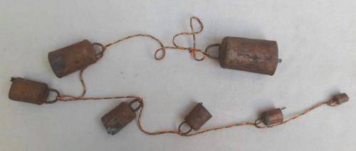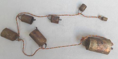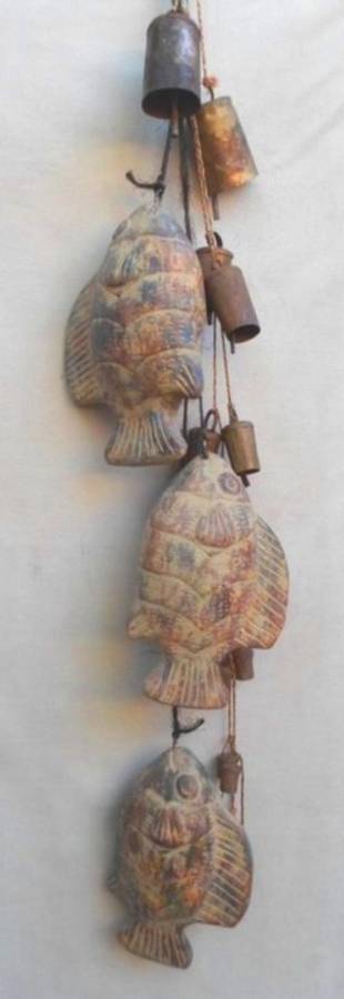 IMAGES CANNOT DO THIS GROUP JUSTICE - THEY LOOK AMAZING GROUPED TOGETHER AND MAKE THE MOST MELODIC 'MUSIC' - GREAT FOR THE PATIO OR BRAAI AREA. THERE IS A STRING OF THREE LARGE FISH - I THINK PAINTED TERRACOTTA - THEIR HUES BLENDING IN BEAUTIFULLY WITH THE TWO STRINGS OF RUSTY-LOOKING METAL BELL CHIMES. EACH FISH IS APPROX 23CM X 15CM X 4CM AND THE STRING IS 102CM LONG. THE TWO STRINGS OF VARIOUS SIZED BELLS ARE 91CM AND 96CM LONG RESPECTIVELY. THEN JUST BECAUSE IT HAS THE SAME LOOK AND ALSO BLENDS IN MUSICALLY SPEAKING, I HAVE ADDED A VERY OLD AND RUSTED SWISS COW BELL - 8CM X 8CM X 3CM. THE WORD 'INTERLAKEN' IS STILL VISIBLE BUT SADLY ONLY GLIMPSES OF THE ORIGINAL IDYLLIC SWISS SCENE REMAIN - IT STILL RINGS AND ONE CAN SAY HAS A CHARM ALL OF ITS OWN!! REFER IMAGES SHIPPING R75