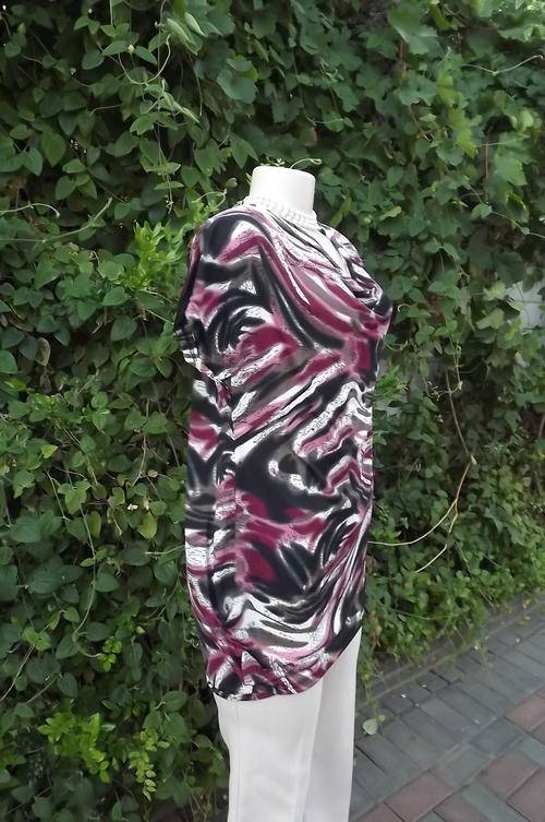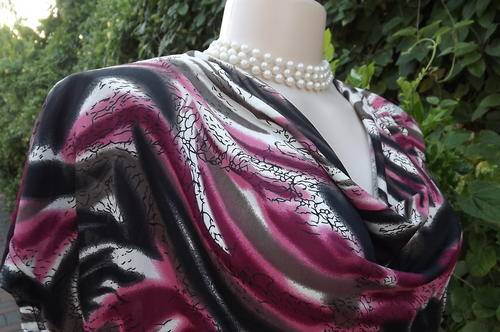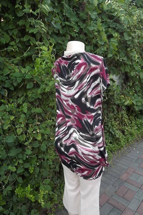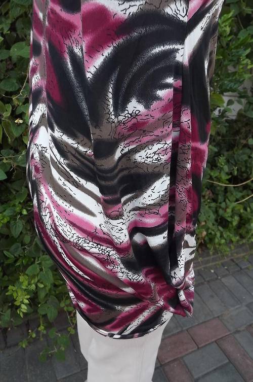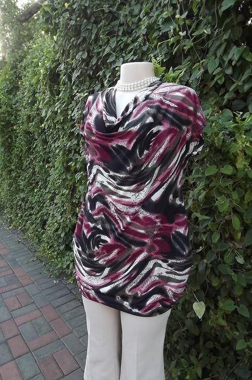 Beautiful long soft stretch polyester top with cowl neckline. Size 36/12. Short cut - on sleeves, little gathering at sides. Graphic print in pink, brown and white. New condition.