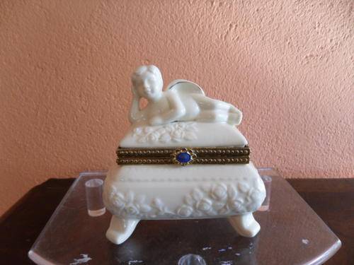 BEAUTIFUL MILK GLASS TRINKET BOX WITH RECLINING CHERUB AND ADORNED WITH ROSES .10.5cm x 11.0cm - IN PERFECT CONDITION.
