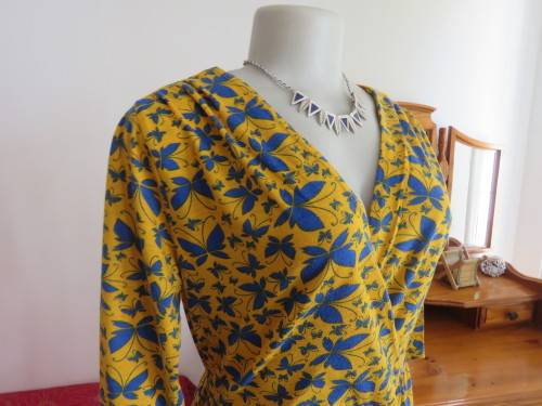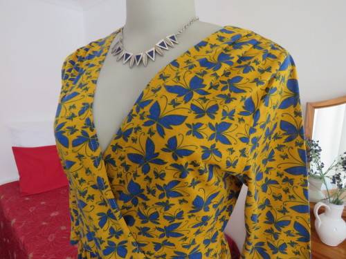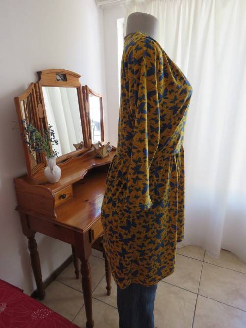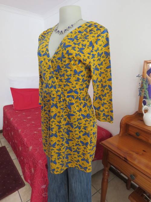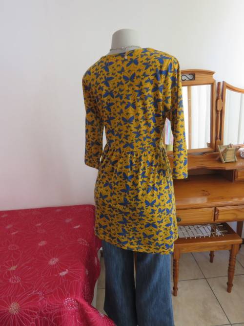 Beautiful mustard colour long top of short mini dress.Size 34/10 by NETWORK with blue butterflies.Cross over bodice.Gathered bottom with belt loops.Elbow length sleeves.In 100% stretch polyester.Good condition.