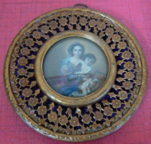 Beautiful old frame pendant, mother and child, looks handpainted, behind glass, 70mm diameter