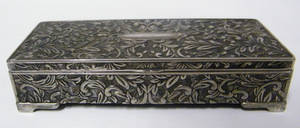 What a lovely item to house all your jewelery! It measures 22.5x9cm and stands about 5cm tall. The inside is material lined and there is a mirror on the inside of the hinged lid. Notice there is a stain mark on the inside and minor damage on the back where the hinges are, this does not affect the hinged lid but mentioned for accuracy sake. A small vacant plaque as part of the decoration on the lid for inscription.