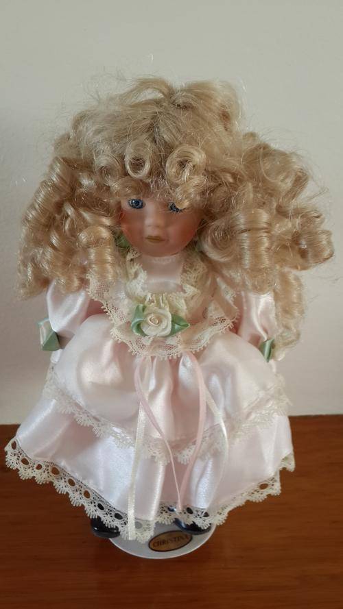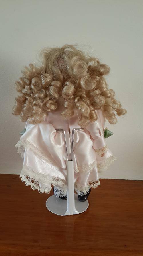 BEAUTIFUL CURLY HAIRED BLONDE LITTLE PORCELAIN DOLL ON STAND
