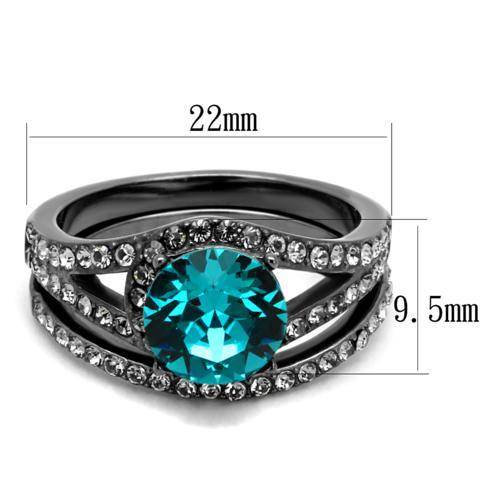 BEAUTIFUL SIMULATED BLUE TOPAZ GUN METAL STAINLESS STEEL LADIES WEDDING RING SET