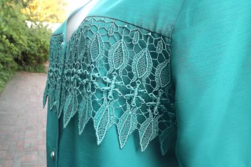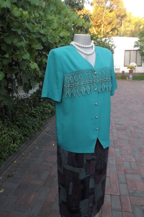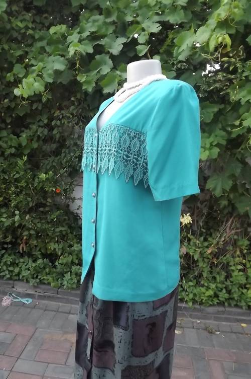 Beautiful smart summer jade colour short sleeve jacket.V neck button down.Size 36/12 by WOOLWORTHS. Yoked front with wide lace decoration