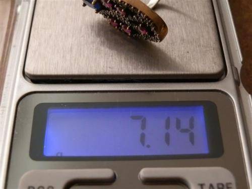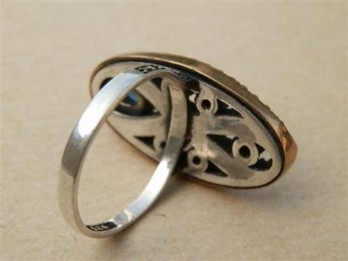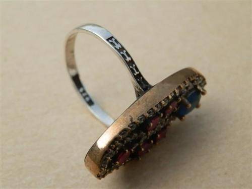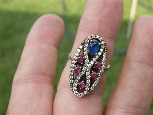 Lovely sterling silver ruby ring with bronze, blue & clear stone accent, marked 925 and in new condition.  The size is 18 mm, the top width 27 mm and the weight 7.14 g.  The hardness of the 5 rubies is 9 on MOHS scale.  Very nice!!