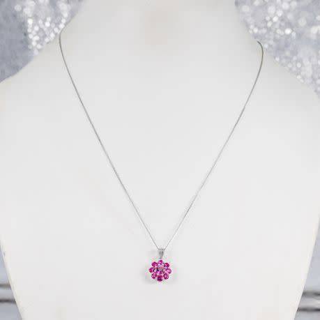 Crafted out of solid sterling silver, this pendant features a beautiful, bright display of natural earth-mined pink topaz gemstones that have been jeweller treated to enhance the colour. The central round cut topaz is 5 mm in diameter, and the eight round cut topaz surrounding it are 2 mm in diameter each. The jewelled part of the pendant is 11 mm in diameter and the pendant including the polished sterling silver bale is 17 mm length. It weighs 2,4 grams. The chain is 44 cm (440 mm) long. Both the pendant and the chain are hallmarked 925 for sterling silver. Beautifully bright in colour and pretty.