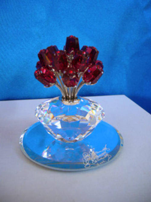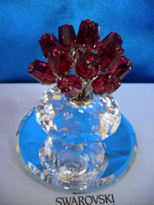 Fifteen ruby red roses with silver metal stems form a beautiful bouquet in an elegant vase. Approx 7-8cm in height. Has opaque swarovski swan motif engraved into the base of the vase.