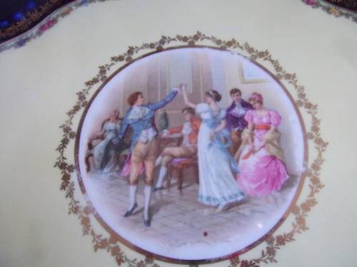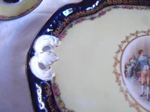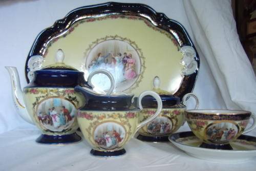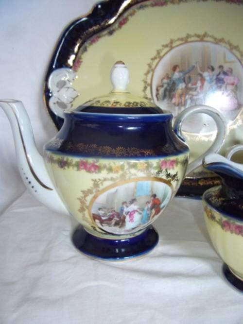 This lovely set with a porcelain tray is in a very good condition with minimal rubbing of the gold trim. It is numbered in gold underneath but has no other markings. It is in the style of Limoges France. It is full sized with the tray being about 40 cm in lenght.