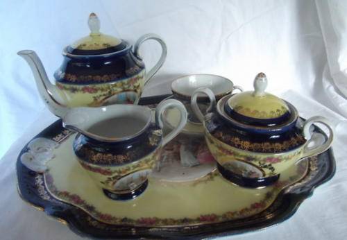 BEAUTIFUL TEA FOR ONE PORCELAIN SET IN COBALT BLUE AND ANTIQUE YELLOW