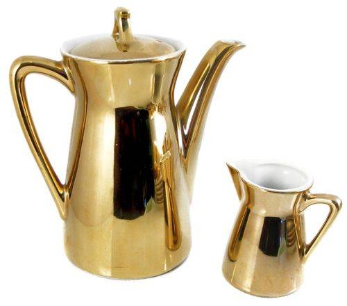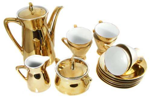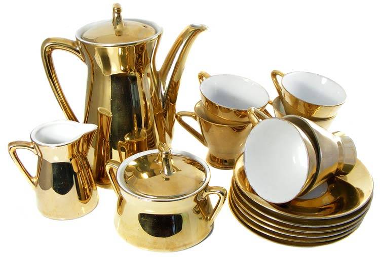 This is a Balboa 22ct gold plated handmade porcelain set, consisting of 6 cups, 6 saucers, coffee/tea pot, milk jug and sugar pot.