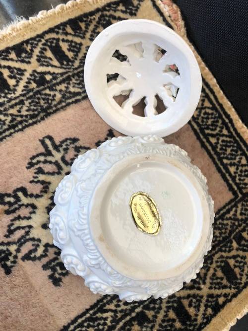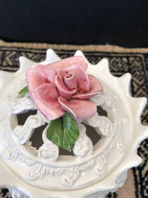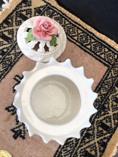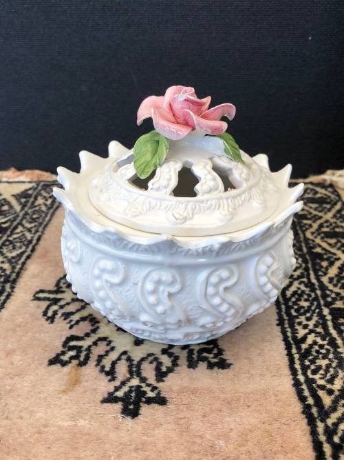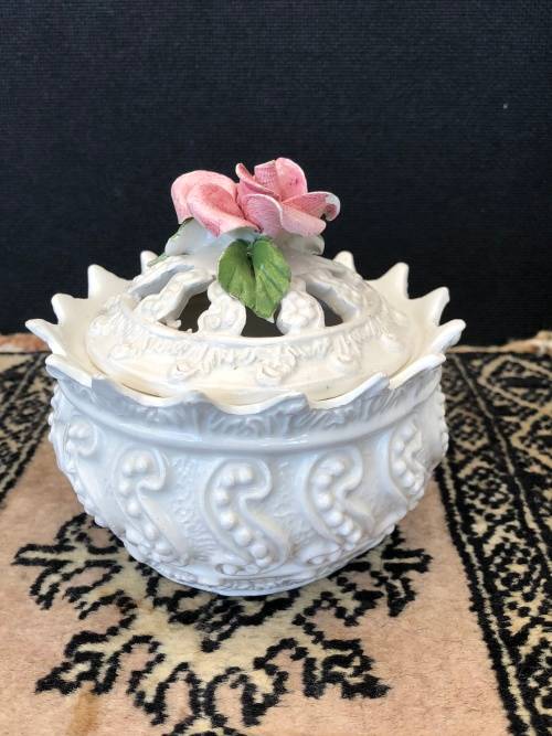 Beautiful Vintage Bassano Handarbeit Porcelain Potpourri Bowl & Rose Lid made in Italy. Absolute beautiful condition. There is a small nick under the one petal, not noticeable. Size 10 cm high x 10 cm wide