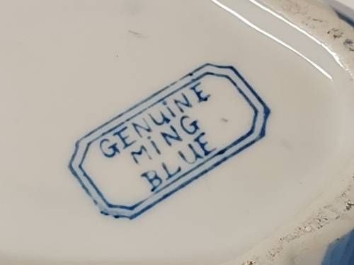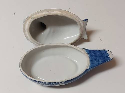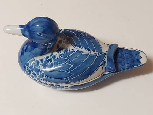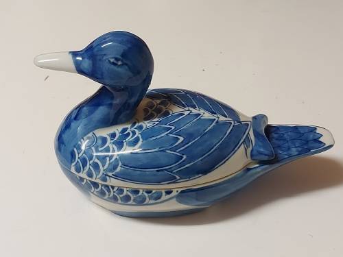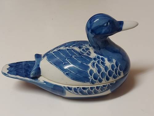 BEAUTIFUL VINTAGE CHINESE BLUE AND WHITE DUCK MOTIF LIDDED BOWL MARKED GENUINE MING BLUE. IT IS IN EXCELLENT CONDITION WITH NO CHIPS OR CRACKS AND THE BOX MEASURES 22 CM LONG, 15 CM HIGH AND 11 CM AT ITS WIDEST POINT