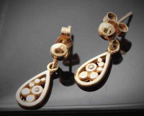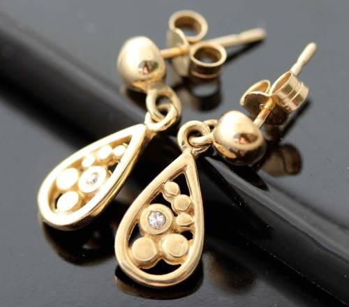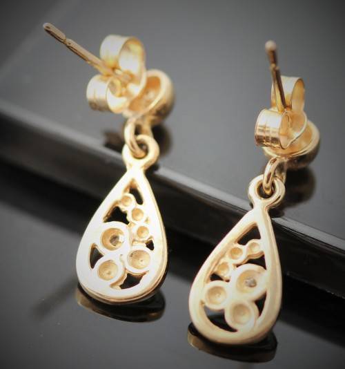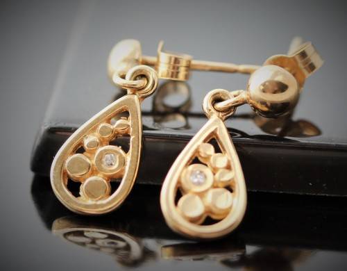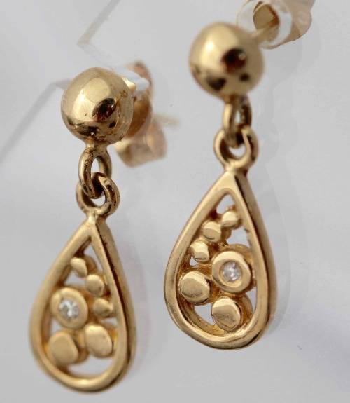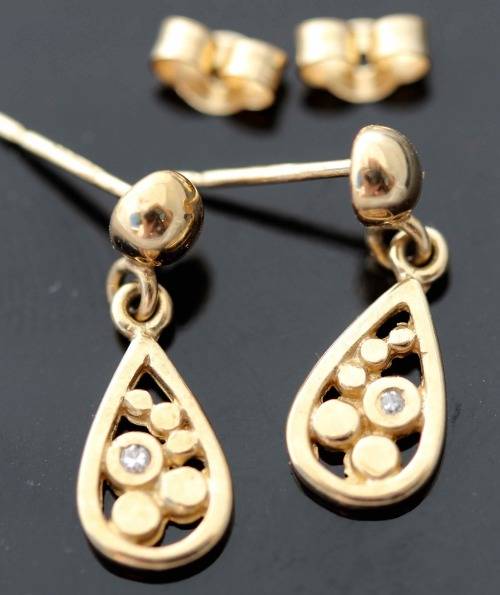These 9ct yellow gold diamond drop earrings are rather pretty. They herald from Birmingham, the jewellery quarter of England. Simple in design but intricate in detail, they feature a modernistic gold droplet design inside the teardrop frame of the earring. Right in the centre of one of the drops, there is a single natural white round cut bezel set diamond. The main part of the earrings are "drop and dangle" attached to the ear stud with a strong pin and dome-head. They bear the hallmarks for English gold, 375 for 9 carat, the jeweller signature and the Birmingham Assay office. They are vintage earrings. Basically in excellent condition with just a tad of buff marks on one of the studs. Only visible under the magnifying glass, not with the naked eye! There is a matching pendant on a gold chain also listed (stock item 2007). To view, click on "All Items" in the top right hand corner of this page and find it listed with my other current jewellery listings.