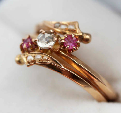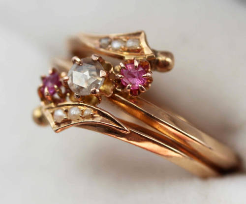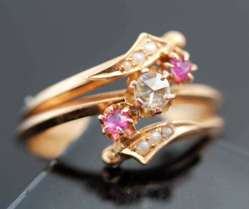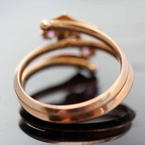 This pretty piece presents a particularly lovely combination of colours. The ring head comprises a central round-cut claw set diamond (3.3 - 3.4mm round faceted) set in the middle loop of a slim spiralled shank. The start and finish of the twists end up parallel to central loop - reaching almost to the opposite shoulders - and feature a gold flourish that each contains 3 seed pearls. The spirals are held apart by 2 x pink claw set rubies (2.3mm round faceted). It is such an unusual ring - mainly as a result of the unusual colour combinations. Just for the understanding - the gold is not coated. The actual metal is itself 9ct rose-gold. The pinks and creamy white colours of the gemstones, pearls and the gold complement each other beautifully. It is very feminine!
