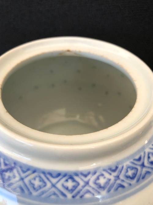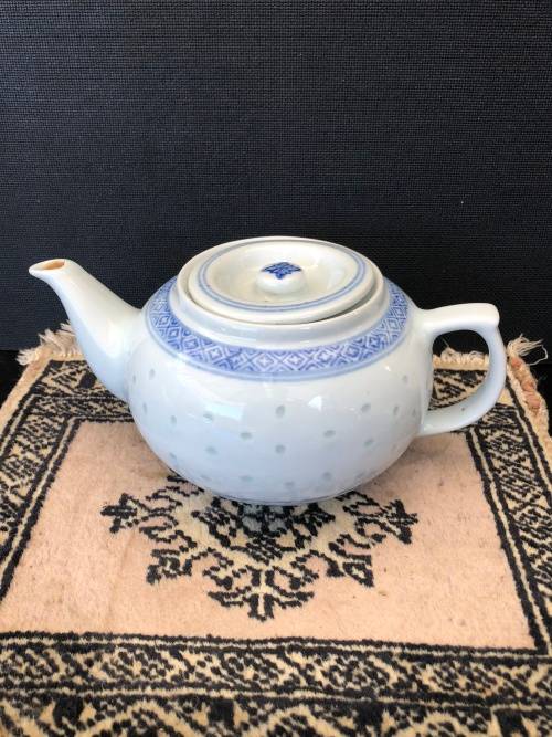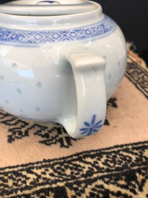 Beautiful Vintage Jingdezhen Porcelain Blue & White Rice Design Tea Pot & Flat Lid, 1lt