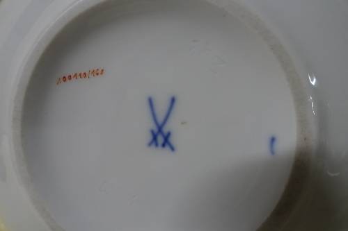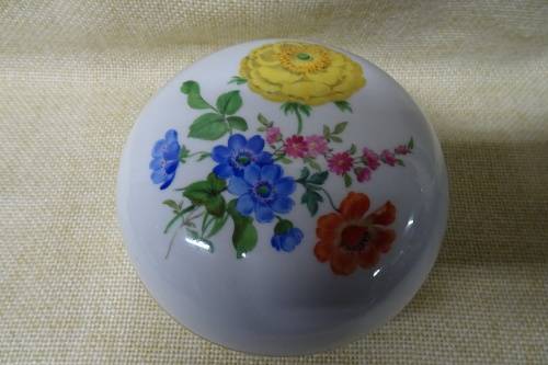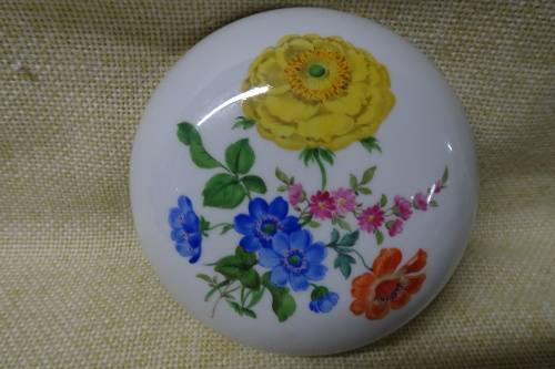 Meissen porcelain, also called Dresden porcelain is produced at the Meissen Factory near Dresden, Germany. This item is handpainted with blue crossed swords mark. The box has a round body with colourful floral bouquet on the top and the base with gilded rims.