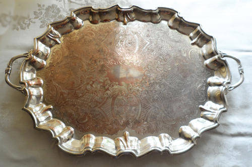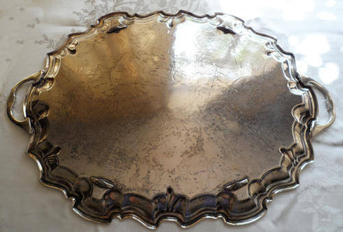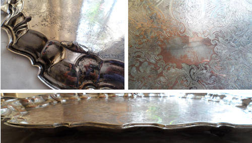 BEAUTIFUL VINTAGE VERY LARGE SILVER PLATED ENGRAVED SERVING TRAY ON SHORT FEET