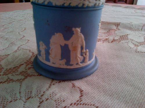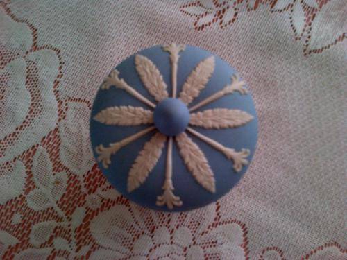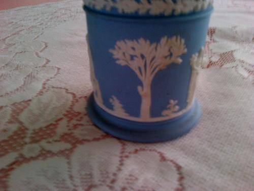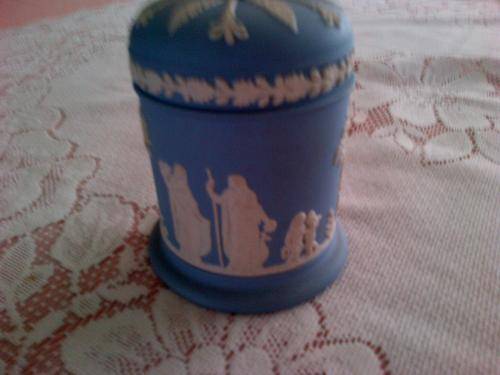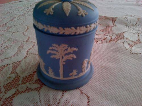 This is a Beautiful Storage Round Container stamped by Wedgewood. This Container is made from a single plain item done by a special method of which the makers go layer by layer over ontop of 1 another layer till the white picture is formed thus having the Wedgewood outcome.. This container is in excellent and perfect condition. Its measurements are : 8.5cm wide and 12cm tall.
