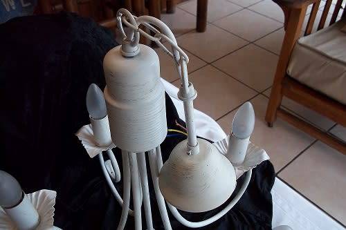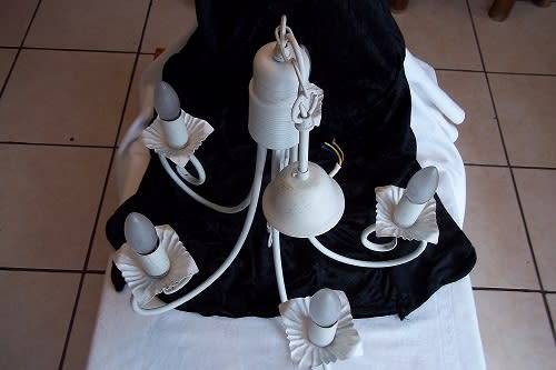 Beautiful white metal 5 arm chandelier. This lovely chandelier has 5 round iron arms extending down and scrolled from the centre piece. The metal light fittings are fixed to the top of the scrolls on the arms. The light fittings have candle sleeves over the electrical fitting. The centre piece extends upwards to the ceiling fitting with a chain. The chandelier is painted white, and would hang 68cm from the ceiling. The chandelier is in good condition. Would make a lovely feature in your home.