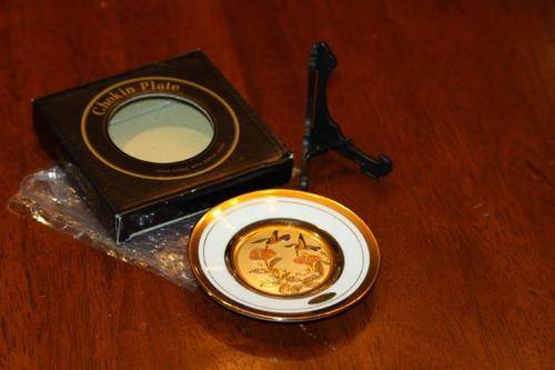 BEAUTIFULLY ENGRAVED, 24K GOLD EDGED CHOKIN PLATE WITH STAND IN THE ORIGINAL BOX.