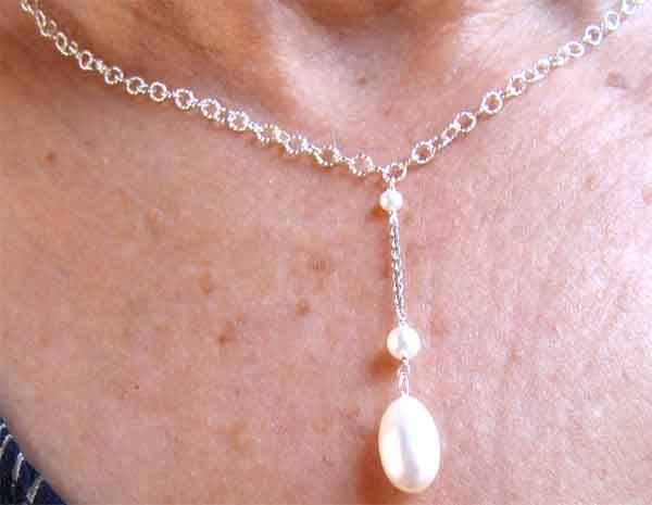 Sterling silver stamped 925 , One pear 13 x 8mm 5.94ct pearl one 5.00 mm round culture pearl and one 3.50 mm cultured pearl. 45cm long chain and weight 4.97 grams