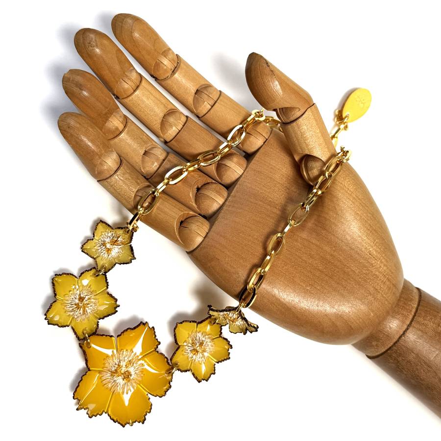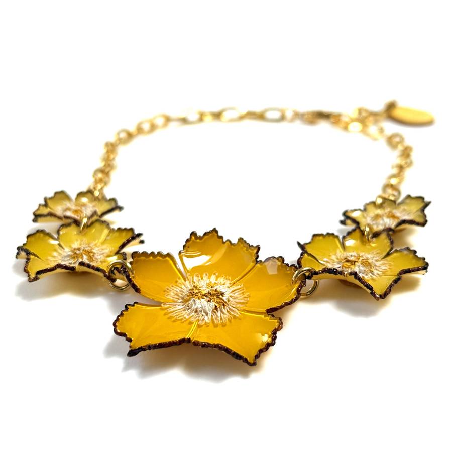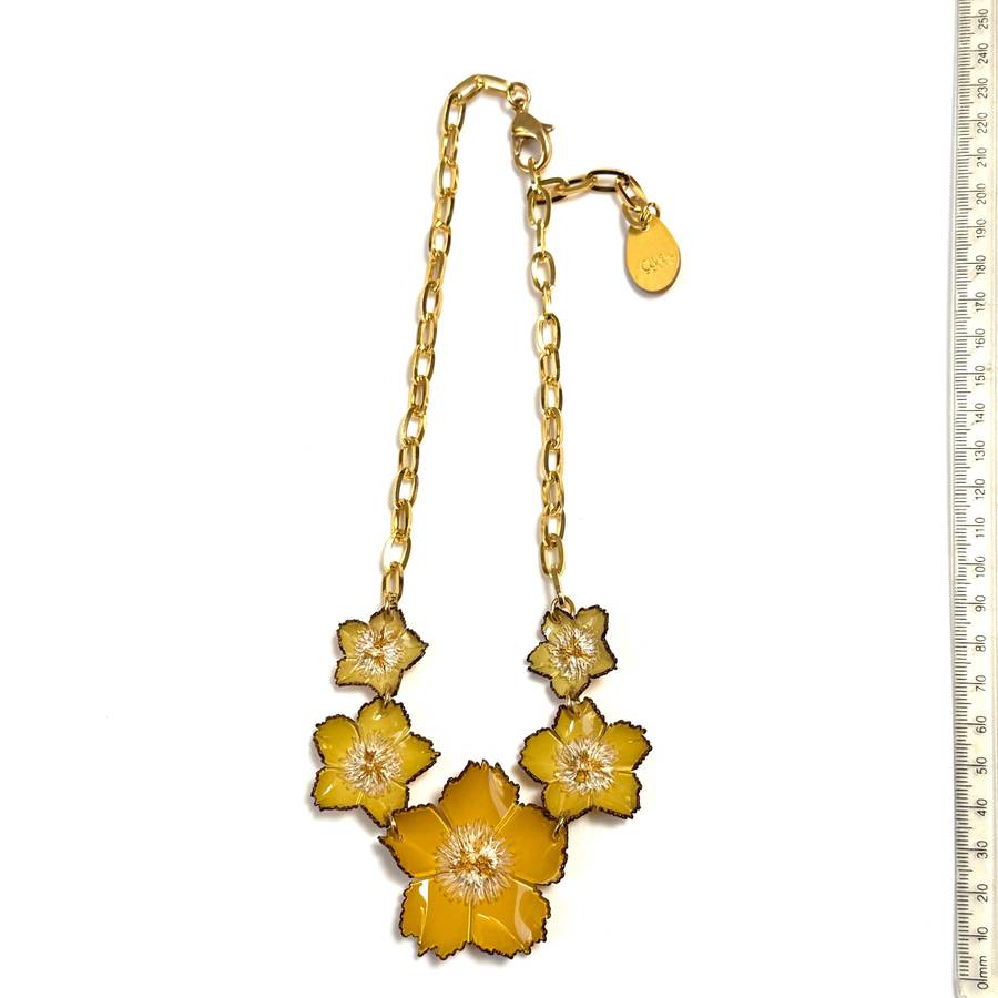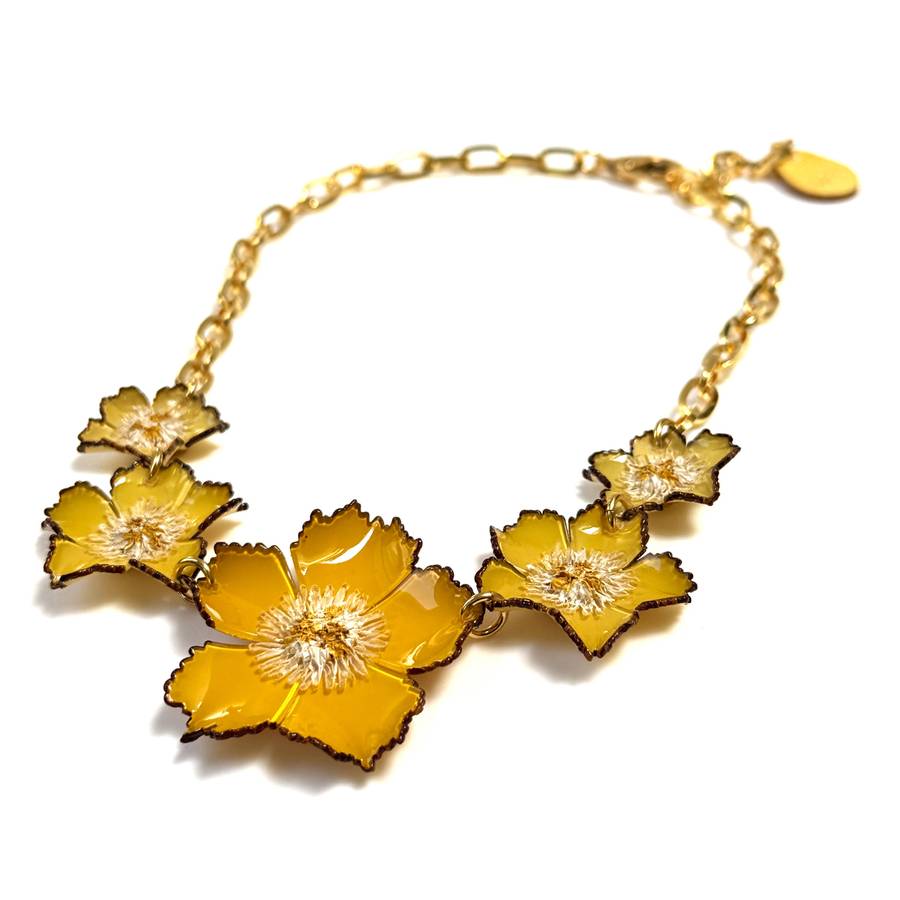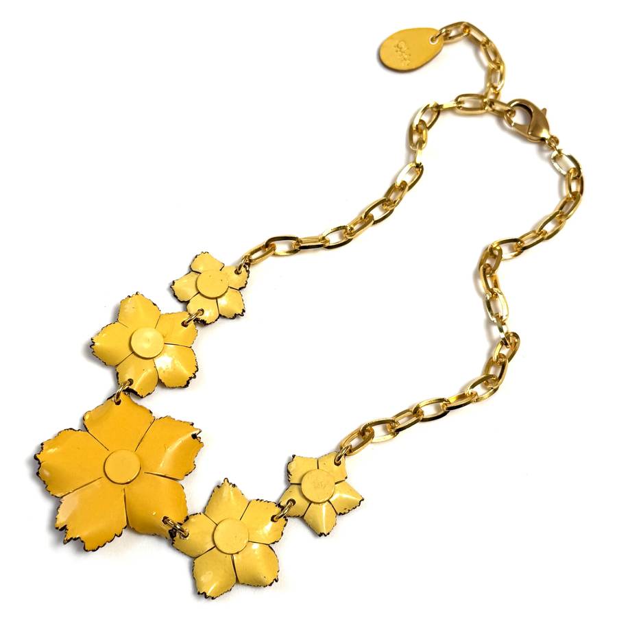The necklace was handcrafted by Cilea Bijoux in France from emaline, an enamelled resin. It features five yellow wildflower elements, graduating in size from the largest at the centre. These are linked together and terminate in lengths of gold-plated chain with lobster-claw clasp. A tag is marked "Cilea Paris".