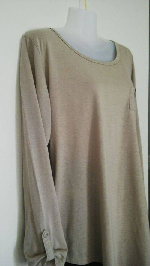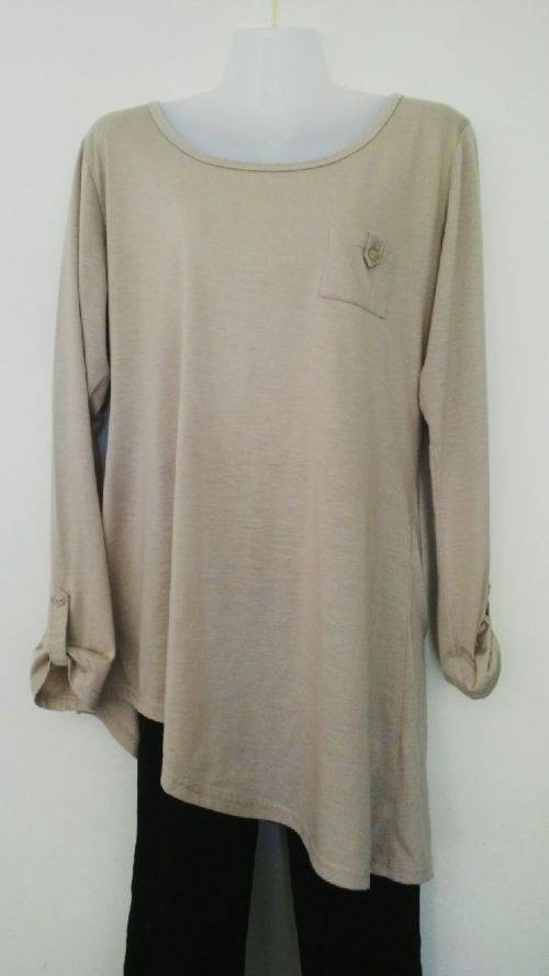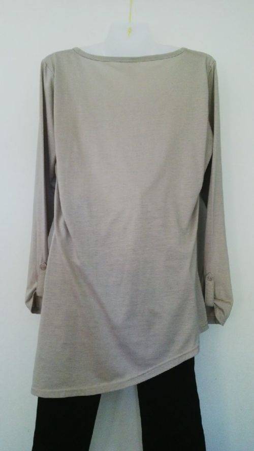 Beige T shirt top with asymmetrical hemline. This is a great versatile top to have in your wardrobe, it can be dressed up with a skirt and heels, as a dress with legings or dressed down with jeans , in Very good condition