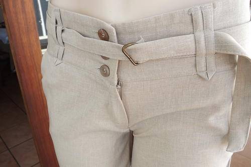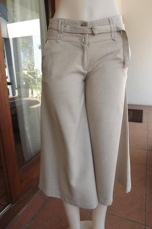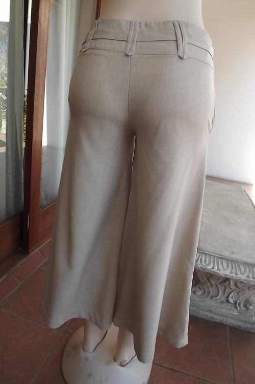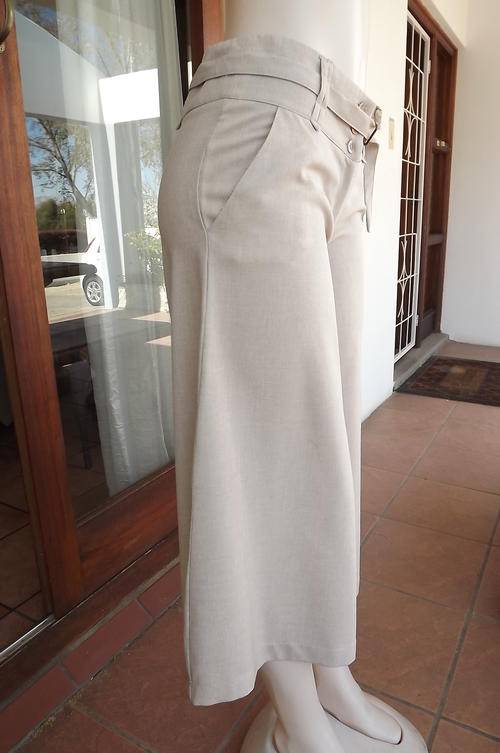 Beige Wide Cut Leg Cropped Pants in wash & wear polyester in size 8/32 from Legit - no stretch - 2 side pockets, low rise with extra wide waistband with thin belt - new condition - our mannequin is a size 34