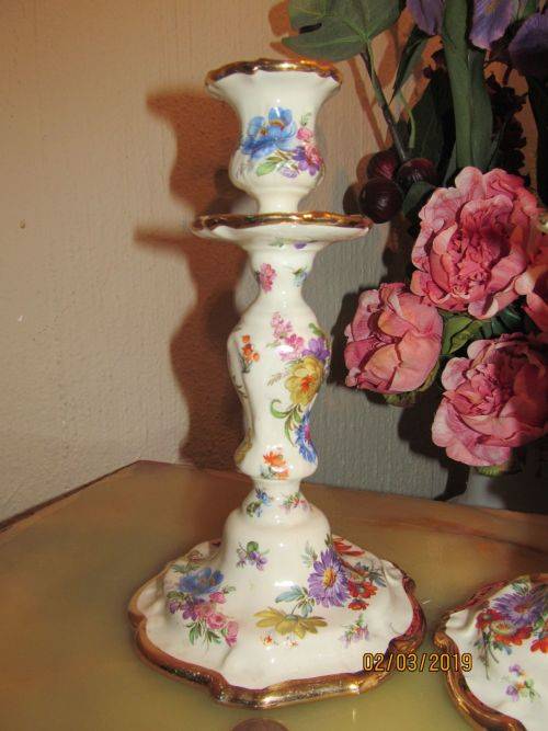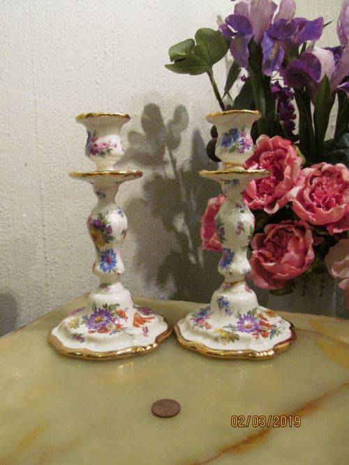VERY RARE VINTAGE 1950-1970 FINE PORCELAIN LOT/SET OF TWO IDENTICAL BOCH FRERES KERALUX BELGIAN CANDLESTICKS - FLORAL GOLD