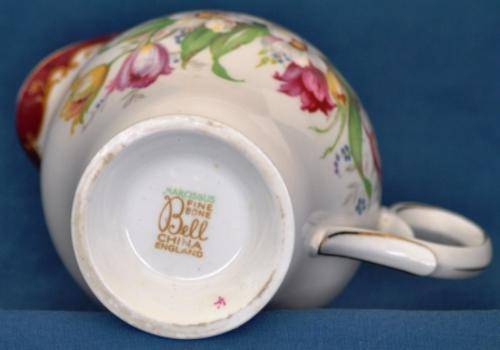 Bell China England, milk jug and sugar basin. These items are made of bone china, and are in very good condition. There are no chips or cracks, with minimal wearing to the gold rim. The sugar basin measures 7 cm high and 12 cm in diameter. The milk jug is about10 cm high.