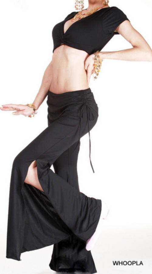 Snug fitting pants with flare and side slits.