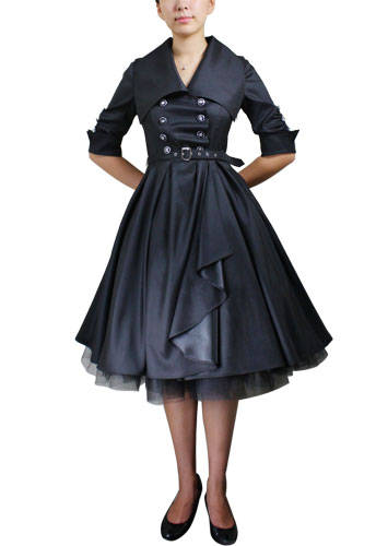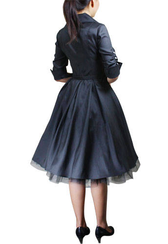 This dress is made of polyester/spandex blend fabric, roll collar, with a belt in the waist, little buttons in the cuff, the sleeves can be turned. The petticoat is not included.