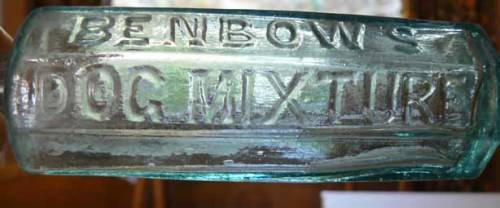 A fascinating little bottle for Benbow's Dog Mixture. Benbow's was established in 1835 and claimed to "cure Distemper, Jaundice and destroy Worms" ! The bottle stands 14.5cm high and is a deep aqua colour with lots of air bubbles. A must for a collection of veterinary medicines or unusual bottles !