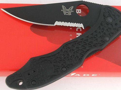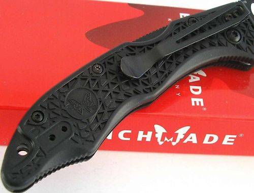 Benchmade Pika II Black Modified Clip Point Blade Knife. Measures 8 1/4" in open position, 4 3/4" closed lockback. 3 1/2" 58-60HRC hardness 9Cr13 stainless steel partially serrated edge clip point black coated blade with thumb hole. Reinforced nylon textured handle for ample grip and large finger groove for added protection. Black reversible tip down pocket clip.