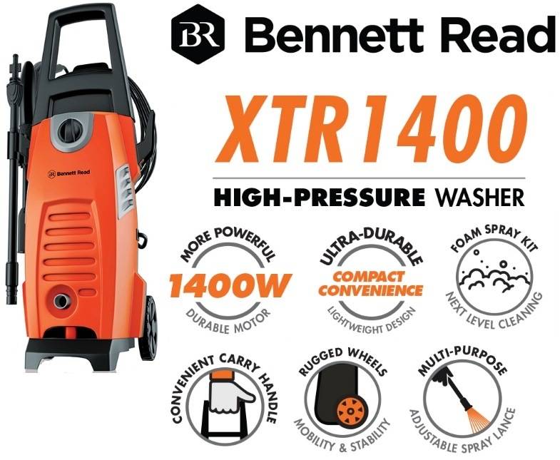 Bennett Read XTR1400W High Pressure Washer - 1400W Motor, Tri-Axial Plunger Pump, Thermal Cut-Off Switch, Inlet Water Filtration, Multi-Purpose Spray Lance, Includes Foam Spray Kit, Rugged Rear Wheels For Mobility And Stability, Extended Handle For Ease Of Use, Includes Foam Spray Kit Retail Box Out Of Box Failure Warranty