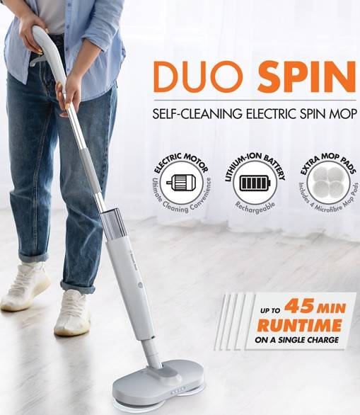 The Bennett Read DUO SPIN Electric Spin Mop makes hard floor cleaning effortless with dual-spinning microfiber mop pads and a rechargeable, cordless design. Its innovative dual-action bucket self-cleans and dries the mop heads, ensuring a pristine finish with minimal effort. Featuring a trigger spray for detergent and an LED mop light for visibility, this lightweight mop combines convenience and powerful cleaning performance.