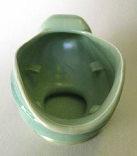 A most attractive BEP Ware vase with a pale green, silky semi-matt glaze, made by Boksburg East Potteries (1946–1960s), a division of the South African Glazing Company (Pty) Ltd, which also made Lucia Ware. The letters 'BEP' and a mould number appear on the base, and the original paper sticker is still attached to the side. Condition good. Length 235 mm; width 110 mm; height 112 mm.