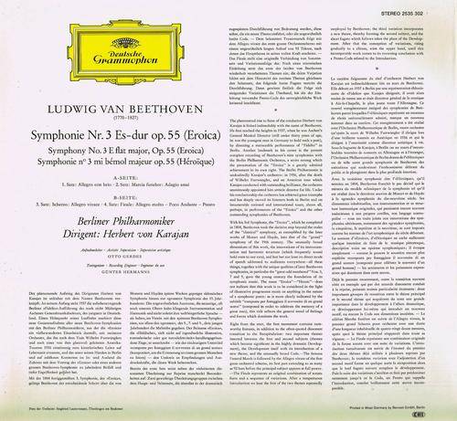 About 1978 German DEUTSCHE GRAMMOPHON re-issue pressing, release number 2535 302, of album BEETHOVEN: Symphonie Nr. 3 “Eroica” - BERLINER PHILHARMONIKER, Dirigent: HERBERT VON KARAJAN. The track details are as shown on the images provided. The record is in a hardly played, near mint condition. The cover has very slightly scuffed corners, plus very light edge crinkles, otherwise in a near excellent shape. |