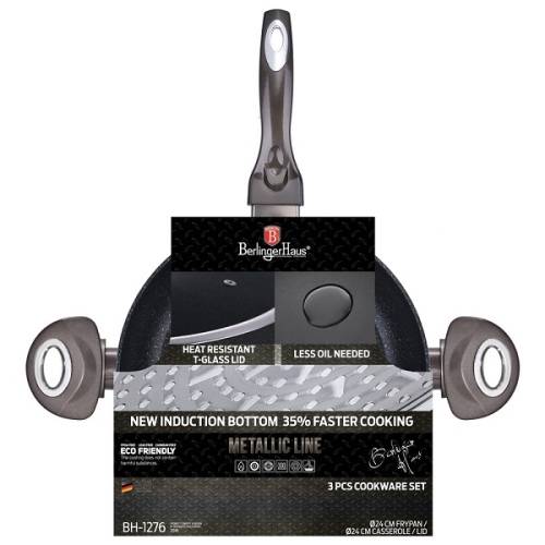 Berlinger Haus Deluxe Carbon Metallic Cookware is made of heavy-gauge cold-forged aluminum, features a smooth, Marble Coated interior nonstick coating, which provides simple healthy cooking, effortless cleaning and outstanding durability. The soft-grip, cast stainless steel handles ensure comfort and stability when handling cookware.