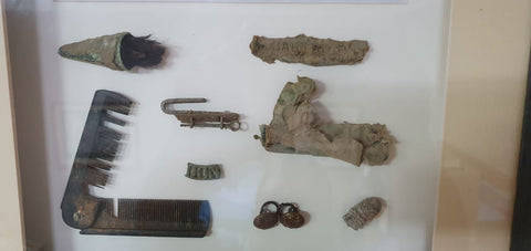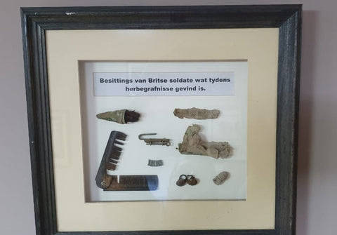 A shadow box frame containing possessions of British soldiers that were found during re-burial. This box frame contains various items from the Boer war, some soldiers were buried in fields during the war, often to be found years later when excavating land for building these soldiers were then returned home. In this box are some items that were found when re-burying them. The frame measures 40.5cm x 37.5cm.