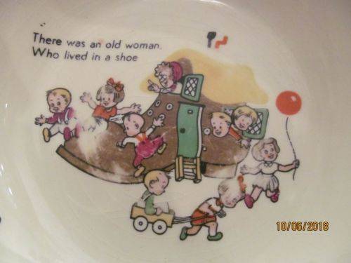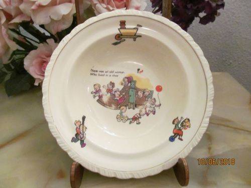 1)- A RARE VINTAGE 1951-1956 PORCELAIN CHILDREN'S NURSERY BOWL DEPICTING A COLORFUL IMAGE ALONG WITH THE START OF A NURSERY RHYME - "THERE WAS AN OLD WOMAN WHO LIVED IN A SHOE" THIS ITEM IS MANUFACTURED BY NEW HALL HANLEY. THE BOWL IS STAMPED UNDERNEATH - "NEW HALL HANLEY, STAFFORDSHIRE,ENGLAND" THE NEW HALL POTTERY COMPANY WAS FOUNDED IN 1899 AND CLOSED IN 1956. THIS ITEM HAS SOME AGE RELATED CRAZING ASIDE FROM WHICH IT IS IN PERFECT CONDITION WITH NO CRACKS, CHIPS, DAMAGES ETC . 3.6cm HEIGHT.....6.8cm DIAMETER OF BASE.....17cm DIAMETER OF RIM
