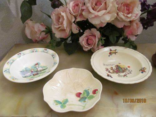 VINTAGE LOT OF THREE COLLECTABLE FINE PORCELAIN DISHES - BESWICK BERRIES SWEETS/BON BON DISH & TWO TODDLER BOWLS (WADE & NEW HALL HANLEY)