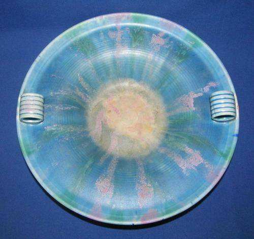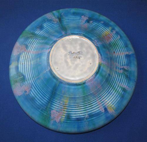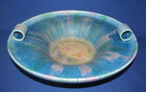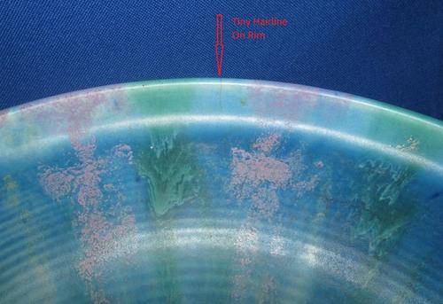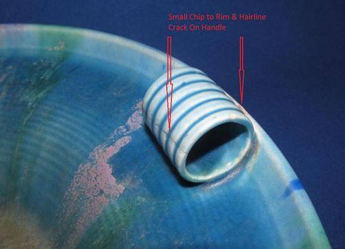 This matte glaze Art Deco Bowl with butter curl handles is in very good condition except for a small hairline on the one handle, a small chip to the rim and a tiny hairline on the rim (see last two images).