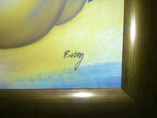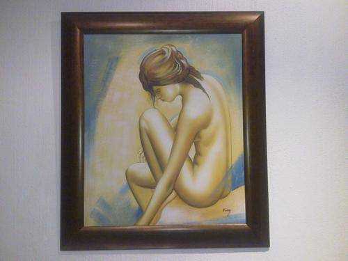 A stunning nude and tasteful study by "Betsy". The color's jump out at you and will brighten any room. The absolutely beautiful frame compliments this painting and measures 75.5cm x 65.5cm. The painting measures 62cm x 52cm. Spoil yourself today!!