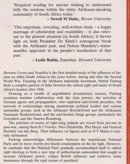 Between Crown And Swastika By Patrick Furlong - published in 1991, 344 pages, softcover, slight scuffing etc & penned inscription on 1st page otherwise all good.