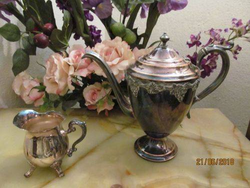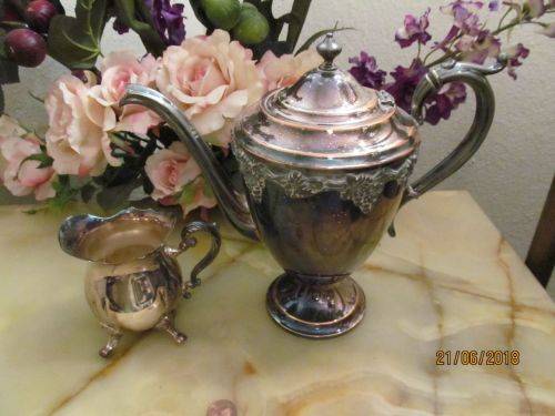 VINTAGE OLD ENGLISH REPRODUCTION BP SILVER PLATED ANCIENT NORMAN STYLE TEAPOT WITH GRAPE AND GRAPE LEAF DETAIL & VINTAGE SILVER PLATED LOUIS PLATE CREAMER WITH CLAW FEET